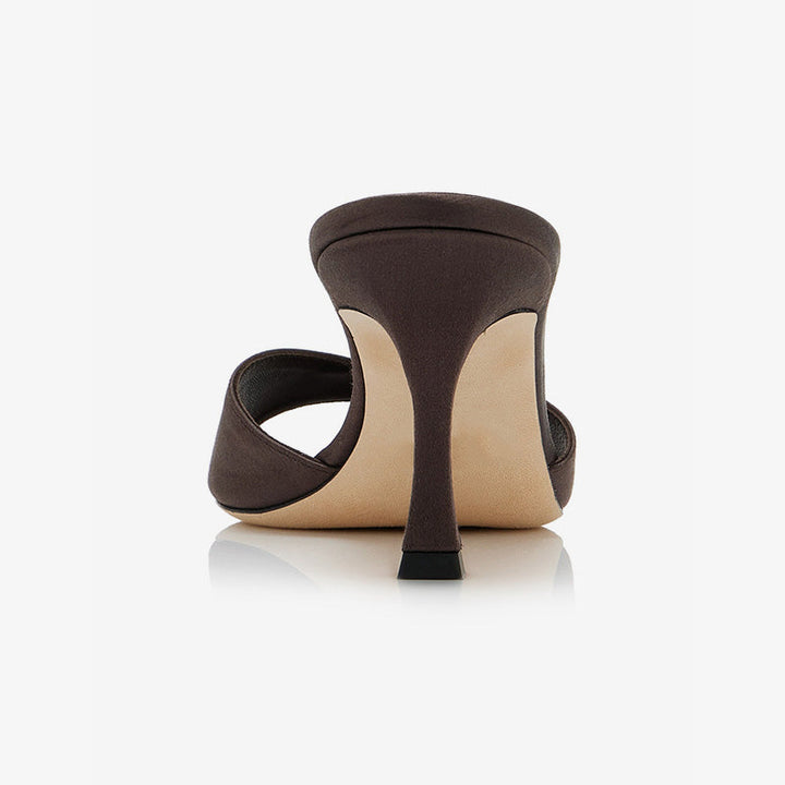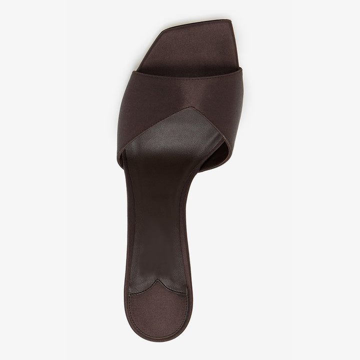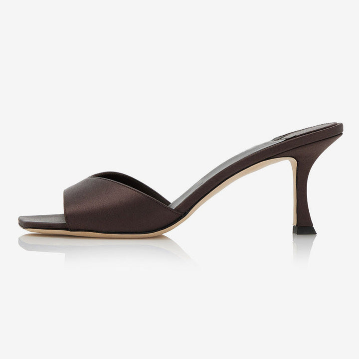 Made from glossy brown satin, these mules feature a low-cut vamp, square toe, and sculpted 70 mm heel for an elegant slip-on design.