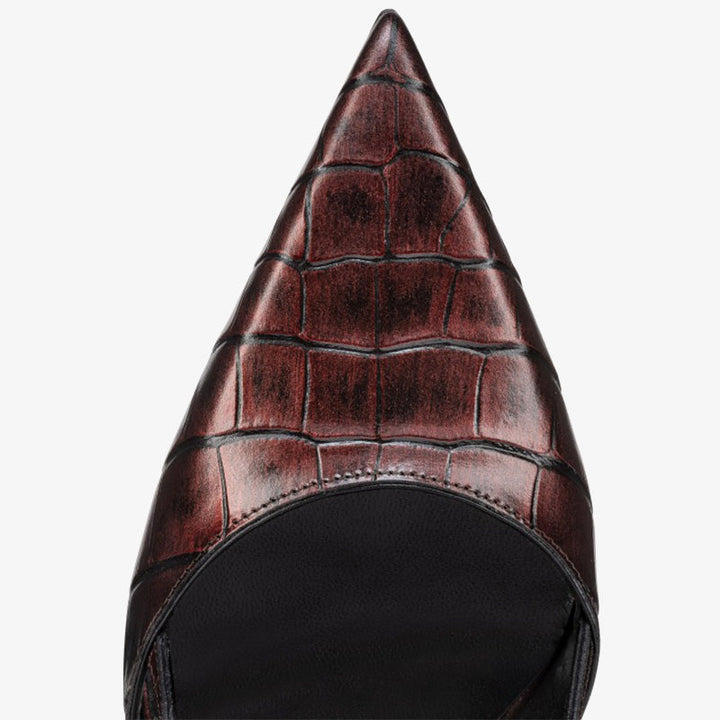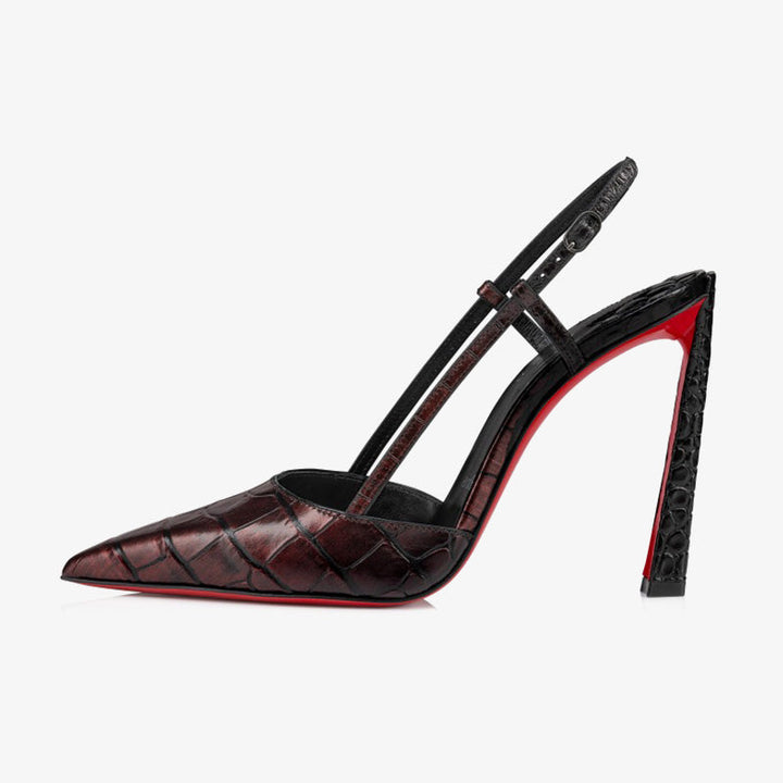 Crafted from 100% leather in a rich brown tone, these pumps blend timeless elegance with modern edge. The pointed toe and streamlined silhouette are set on a 100 mm heel, offering a graceful lift perfect for both day and evening wear.