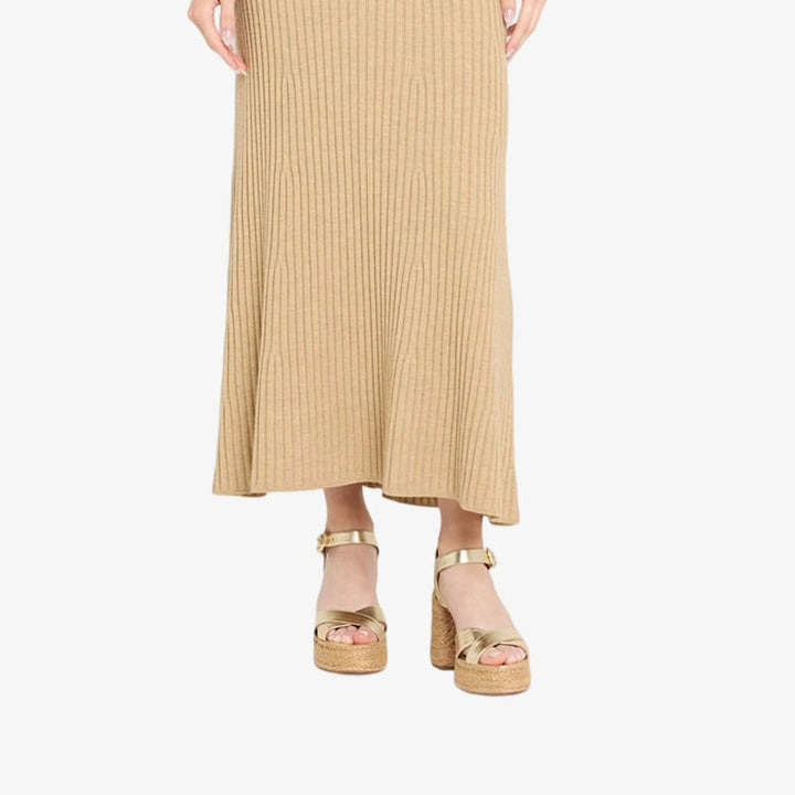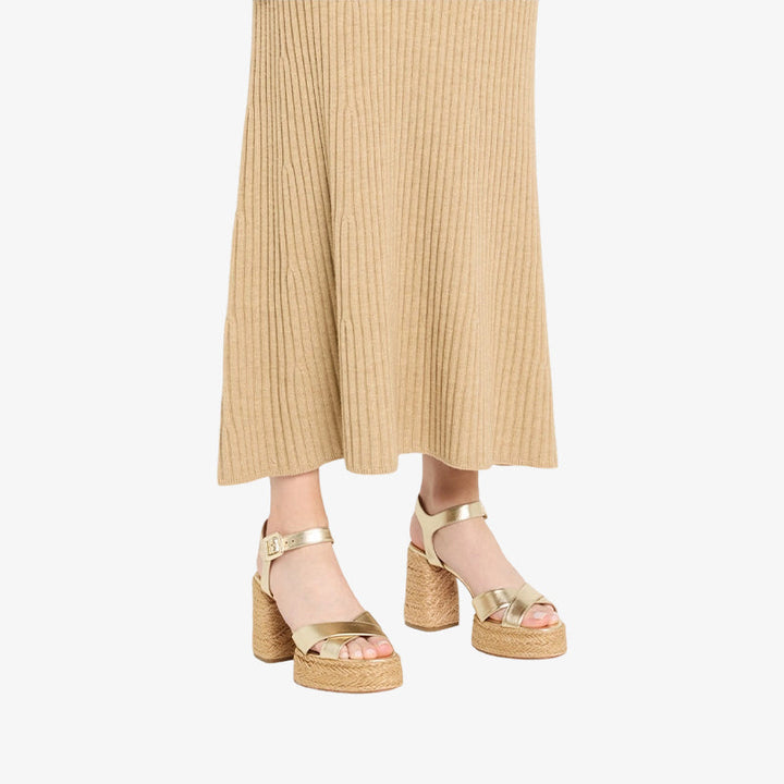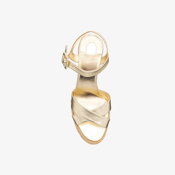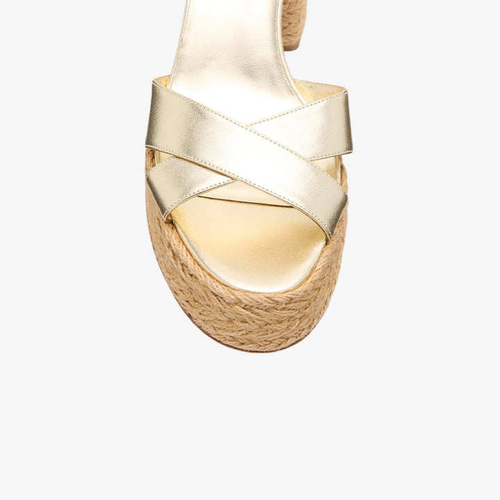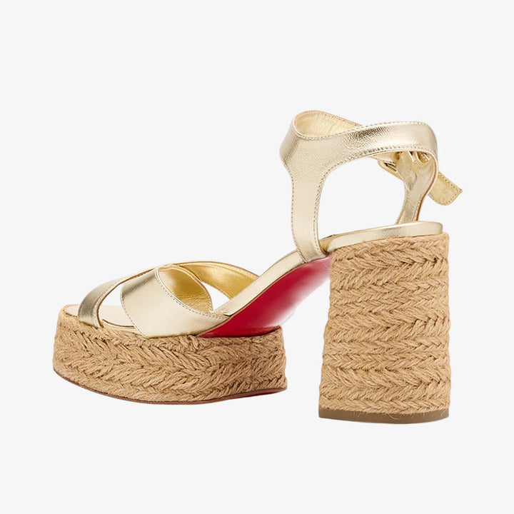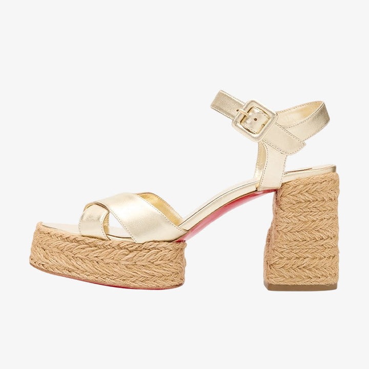 These gold metallic leather espadrille sandals feature a braided jute block heel, open toe, crisscross vamp, and an adjustable ankle strap. Finished with a red leather outsole and leather lining, they add a refined touch to any summer look.