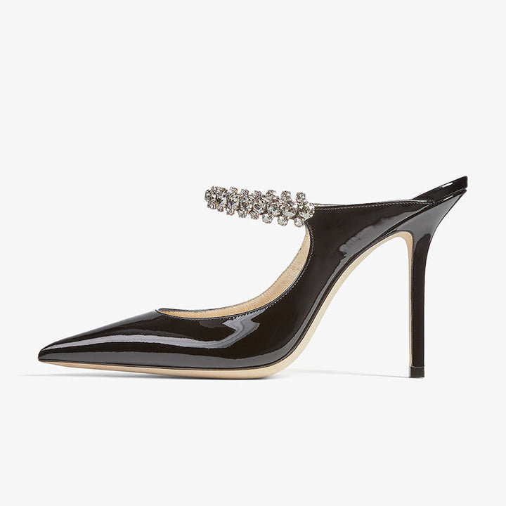 Modern and chic, these black patent leather mules feature a pointed toe and a crystal strap for a touch of elegance. With a sleek slip-on design and a 100mm heel, they elongate the legs and elevate any evening look. Leather lined with a leather sole.