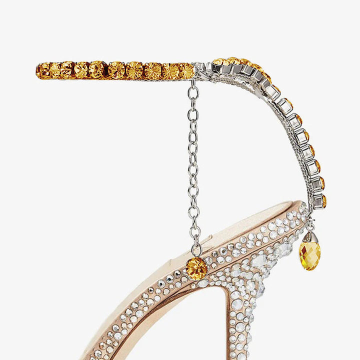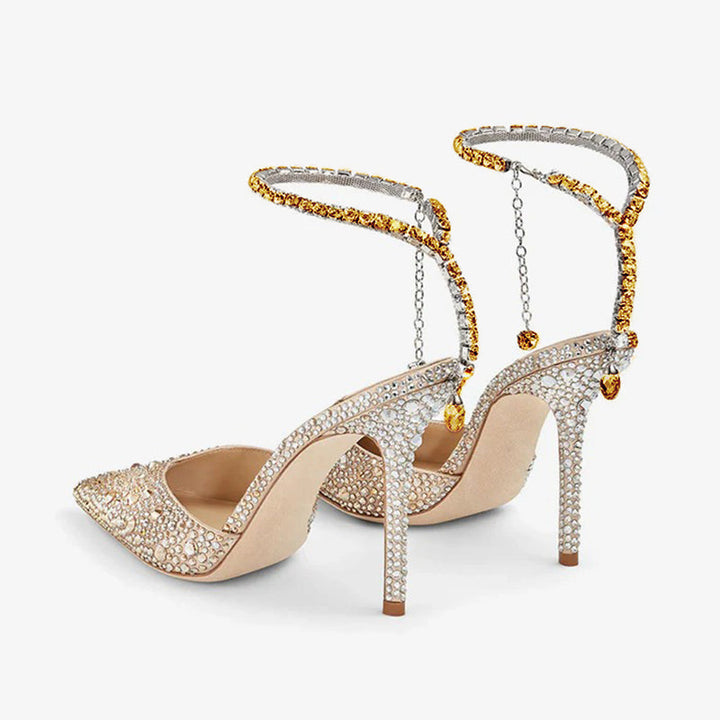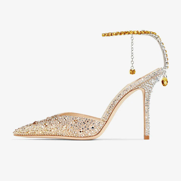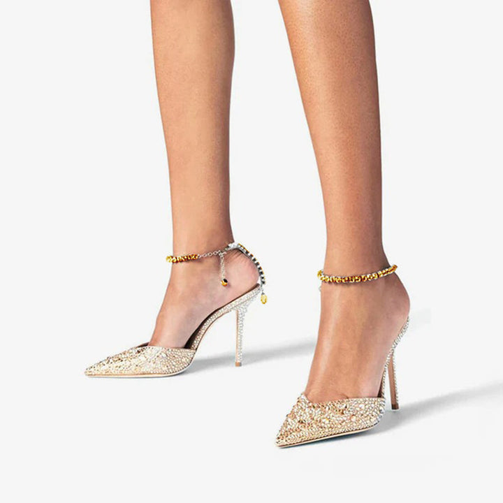 These rose gold satin pumps are embellished with hotfix crystals and feature a hand-finished crystal anklet with a drop crystal at the back. Set on a 100mm stiletto heel, they combine luxurious shine with a secure and elegant fit. The satin finish enhances the shimmer effect, while the delicate rose gold hue adds a modern romantic touch.