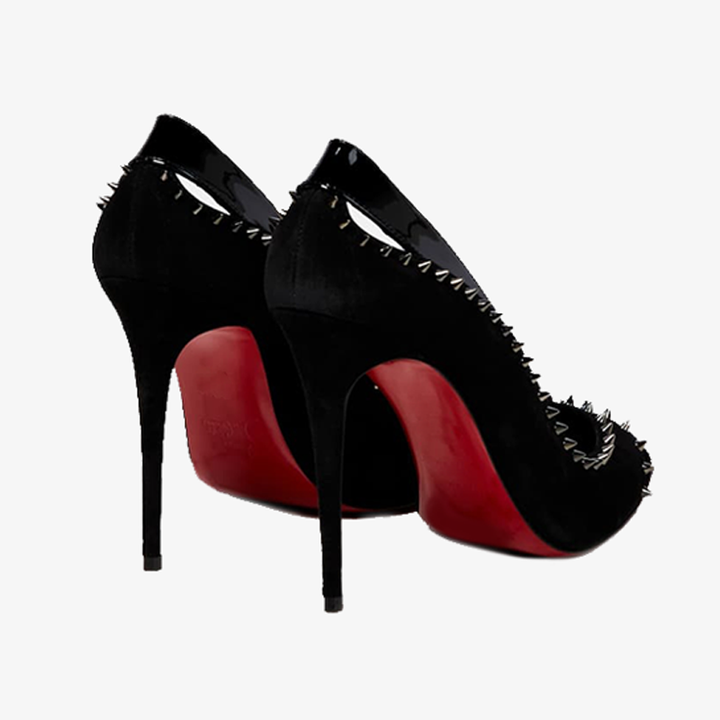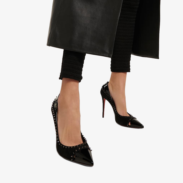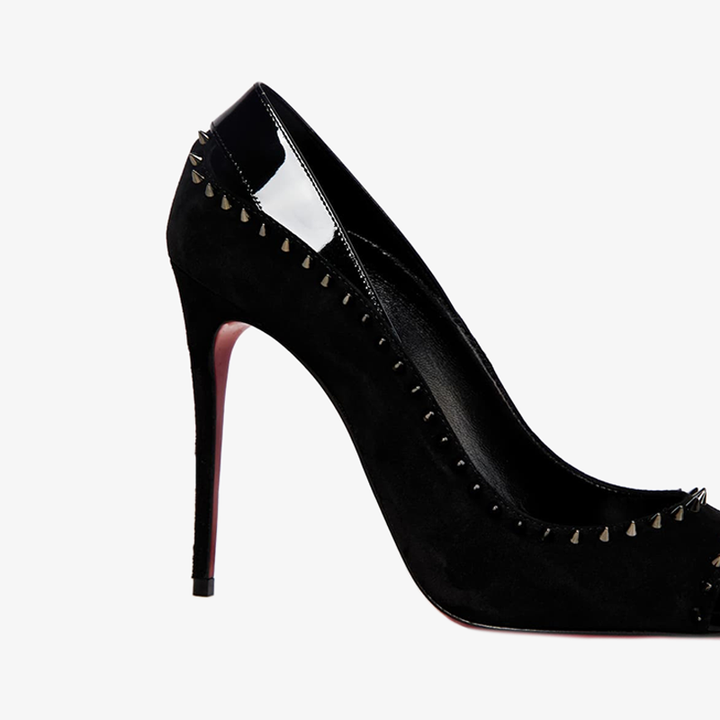 These pumps blend elegance with daring details. Featuring a pointed silhouette, they're crafted from suede with patent leather panels, adorned with spikes, and set on slender 100 mm heels. The leather lining and signature red leather sole add a touch of luxury.