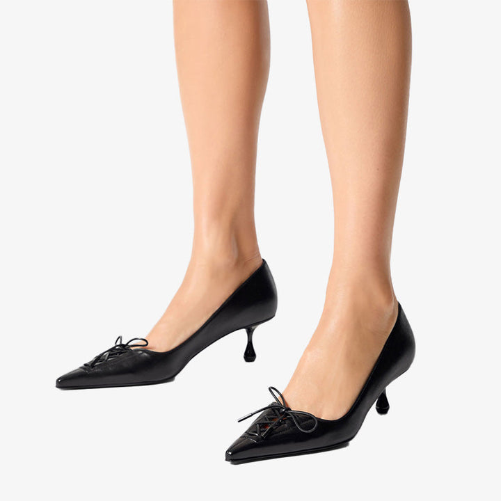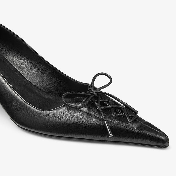 This elegant pump features a timeless silhouette enhanced by a signature drop heel. The corset-inspired upper, meticulously crafted with hand-threaded leather laces, adds a sophisticated touch. Finished with leather lining and sole, this design offers both style and comfort, perfect for any occasion.The heel height of this pair is 30mm.