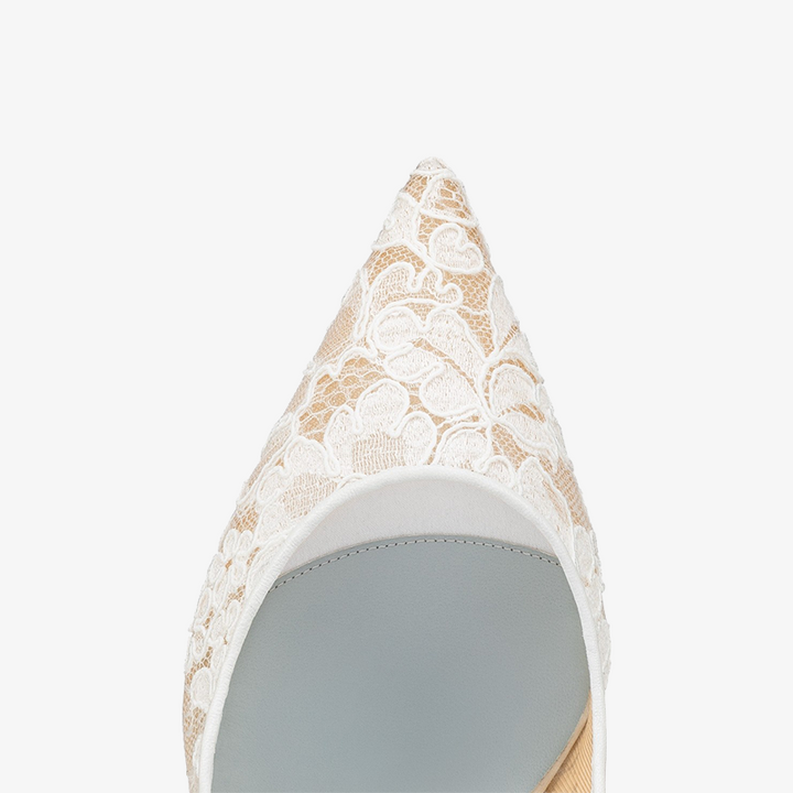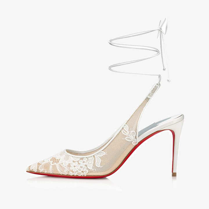 Set on an 80 mm heel, this slingback pump features a pointed toe and an elegant low-cut vamp. A slender lace wraps around the ankle, tying at the back for a contemporary finish. Crafted entirely from delicate white lace, this pump exudes sophistication and timeless style.