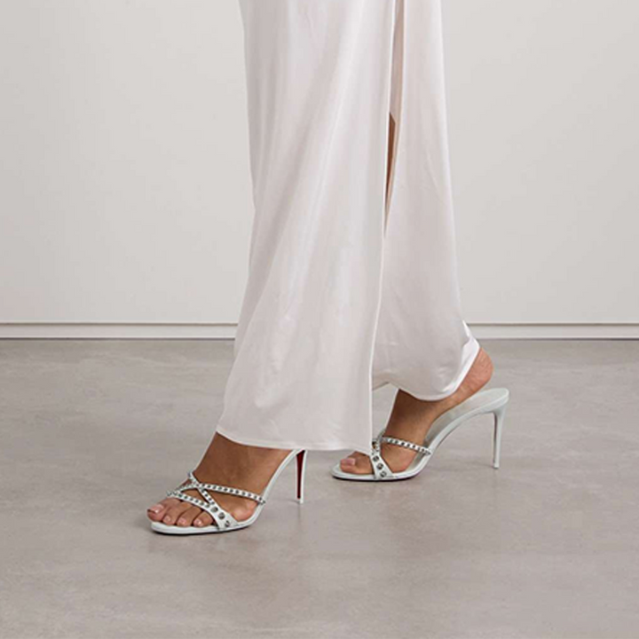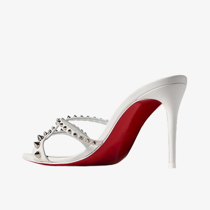 The sandal features signature silver-tone studs for a rebellious touch. Made from supple white calf leather, it is designed in a strappy silhouette and sits on slim 80 mm heels. A slip-on design adds to its ease of wear.