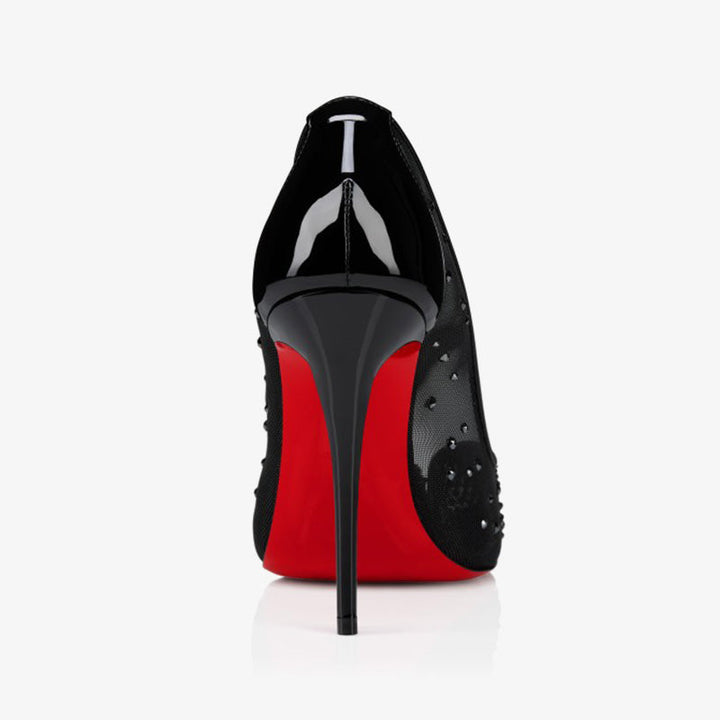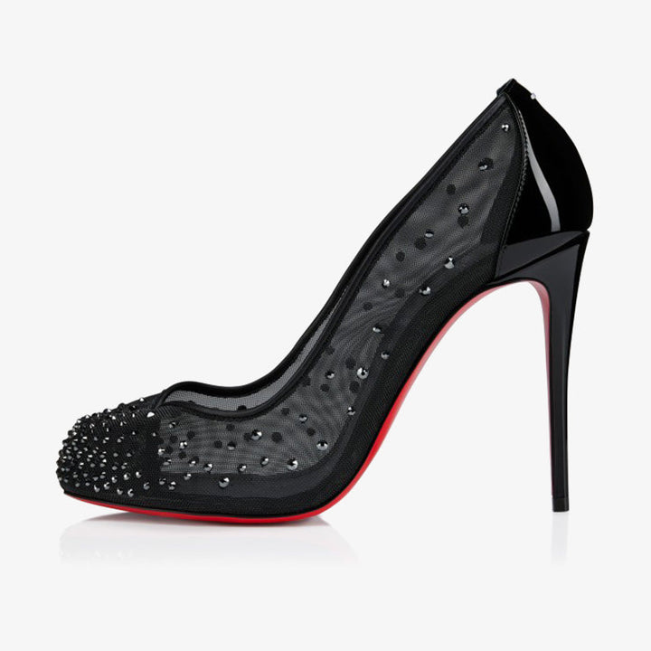 This elegant pump features the iconic Split-toe shape, crafted from sheer black mesh paired with contrasting patent calf leather. Adorned with a gradation of rhinestones, it offers a touch of sparkle while sitting on a 100mm stiletto heel. The perfect balance of sophistication and bold design, these pumps are sure to make a statement.