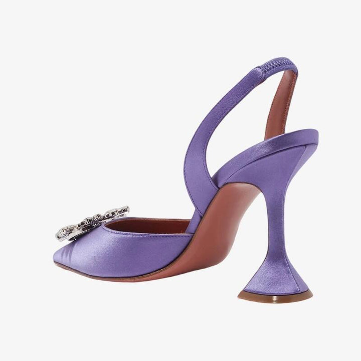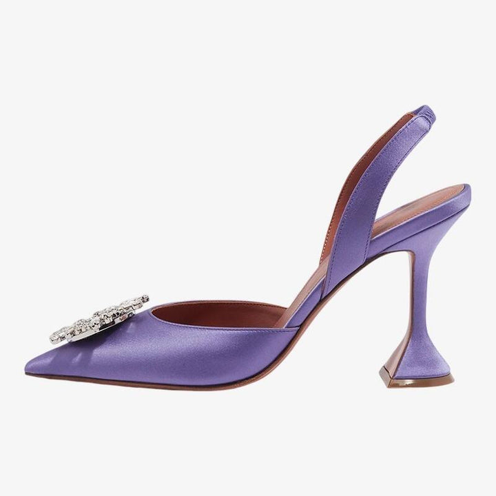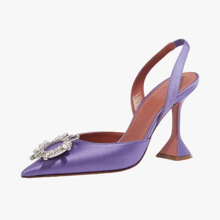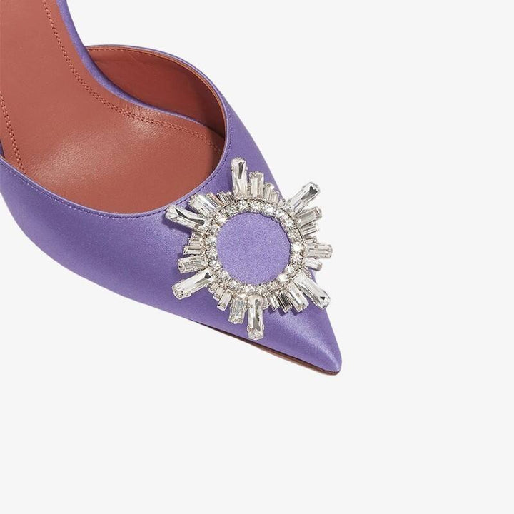 Command attention in these regal purple satin slingbacks, featuring a dazzling clear crystal buckle that creates brilliant contrast against the deep amethyst hue. The structured 95mm heel provides elegant height with stability, while the leather construction ensures lasting comfort.