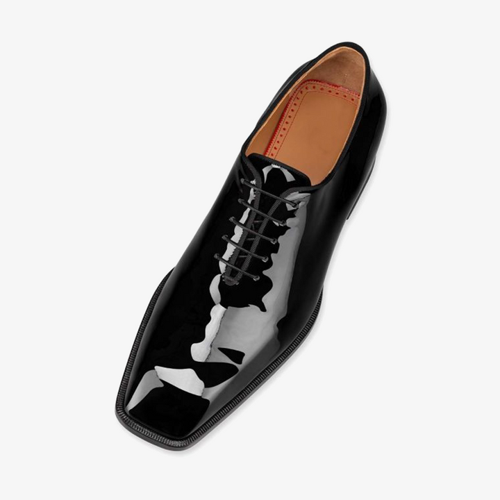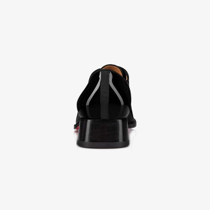 This brogue shoe showcases a slender silhouette with a slightly square toe, highlighting its elegant lines. Crafted from black patent calfskin leather, the vamp is finished with delicate lacing and refined grosgrain edges. Mounted on a small square heel,, making it a timeless addition to any wardrobe.