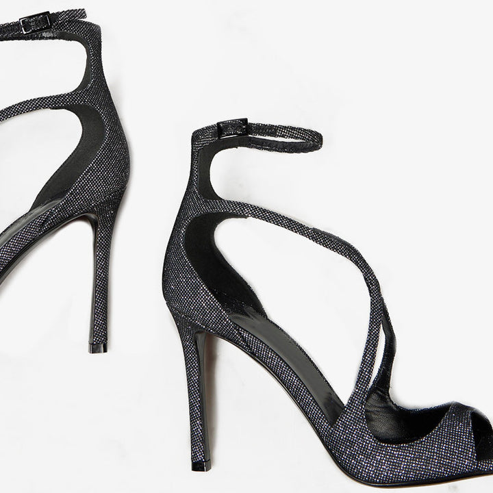 Crafted , these glamorous glitter sandals feature a square open toe, a 95mm heel, and a sleek buckle-fastening ankle strap. Designed with a fabric upper, leather lining, and leather sole, they offer a refined finish. Note: runs slightly small—consider sizing up.