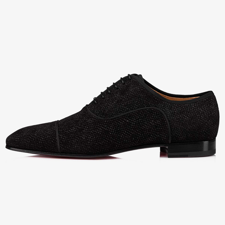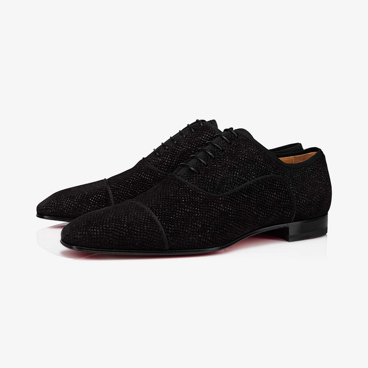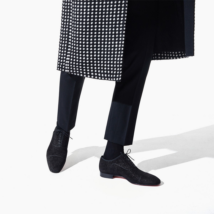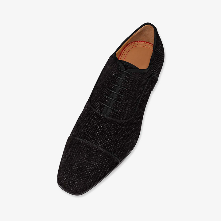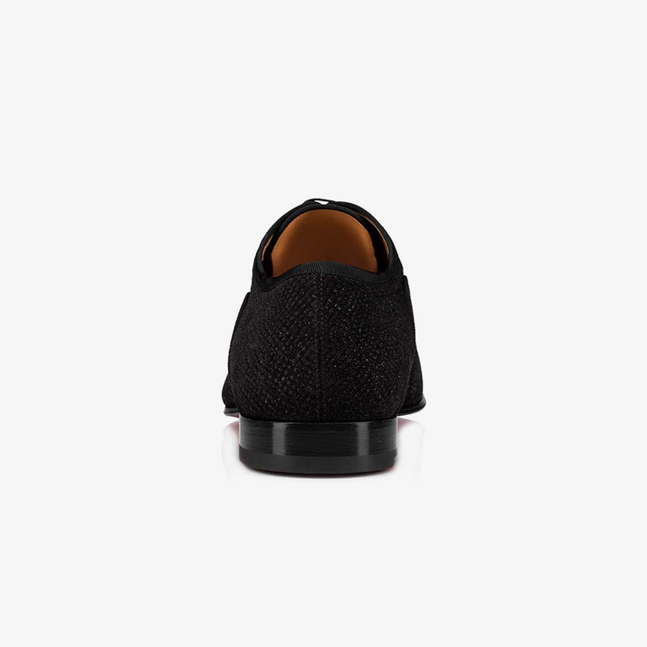 With its sleek appearance and elegant, light appeal, this closed-lace Oxford shoe has been a staple in wardrobes. Featuring a thin outsole and elongated silhouette, it is crafted from stunning black leather, embellished with metallic elements and outlined with a couture black grosgrain ribbon trim for a sophisticated finish.Upper: 100% fabric