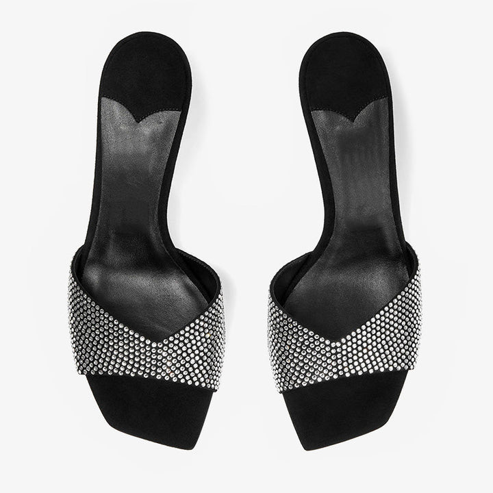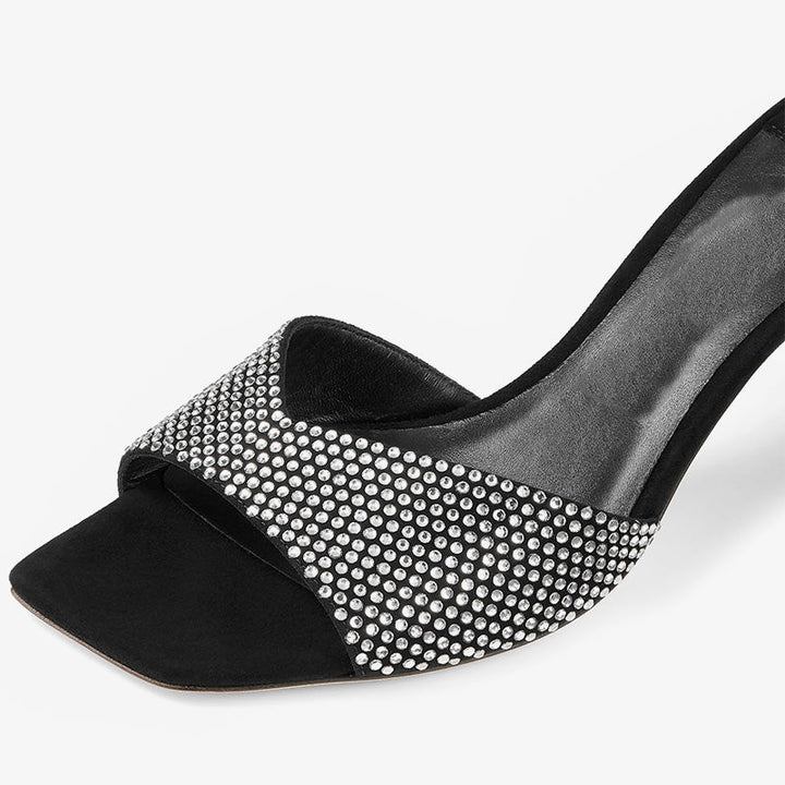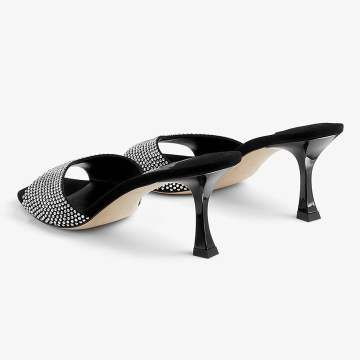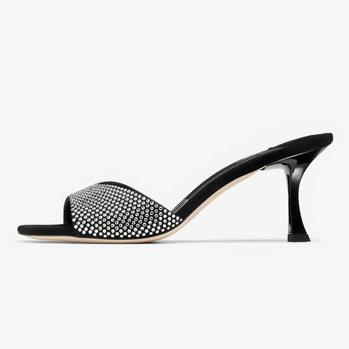 Crafted from black suede, these sandals feature a slim sculpted heel and a wide vamp encrusted with shimmering crystals. The square toe and sleek silhouette add a modern edge to this glamorous design.