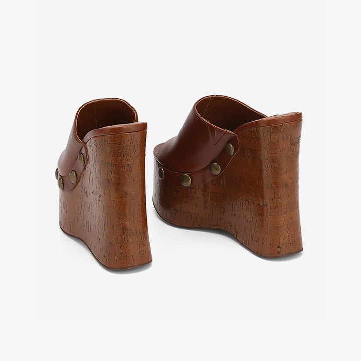 Elevate your summer style with these sleek peep toe wedge mules, crafted from premium brown calf leather. Featuring a 140 mm cork-wrapped platform heel, full leather lining and decorative nail accents for a refined finish.