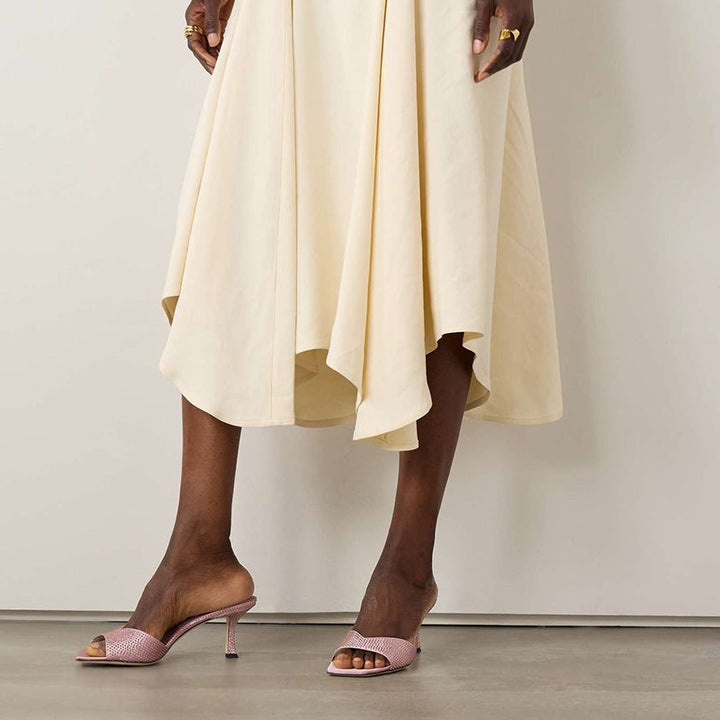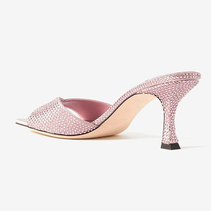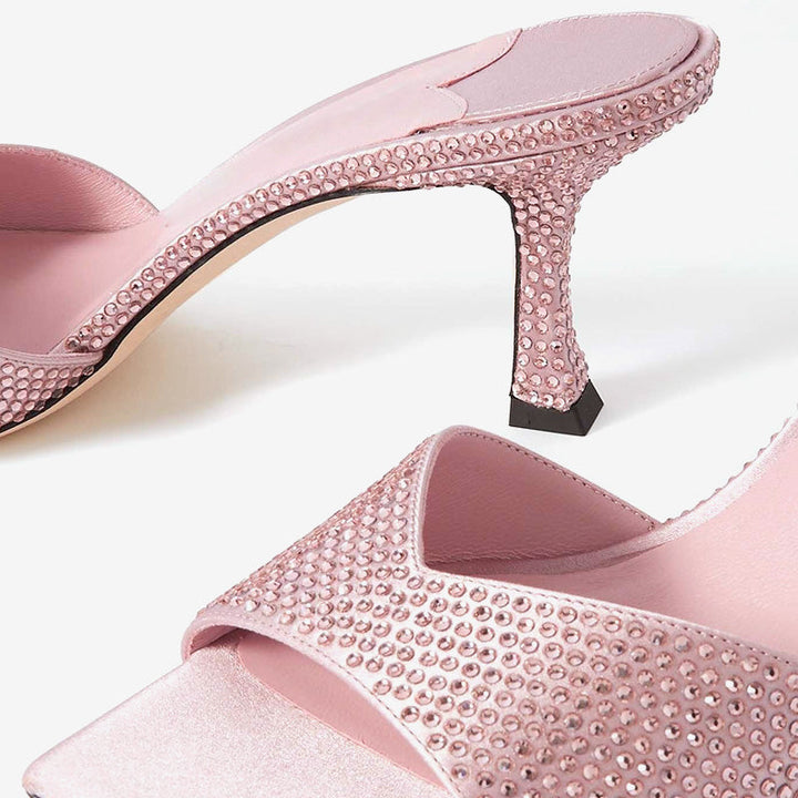 Crafted from lustrous pink satin and covered in sparkling crystals, these slip-on mules feature a flattering V-shaped vamp, square toe, and sculpted 70 mm heel for dazzling comfort from day to night. Color:pink