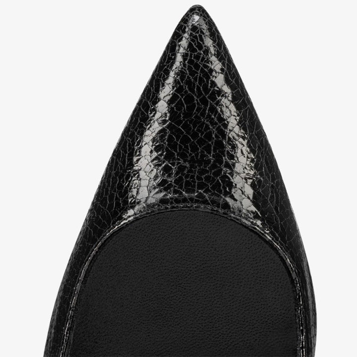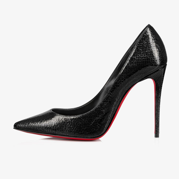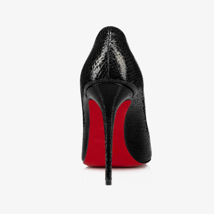 The pump is an iconic model featuring elegant lines. It showcases a pointed toe and a signature low-cut vamp that daringly reveals the foot. Crafted entirely from Star textured black calf leather, this sophisticated design sits atop a 100 mm heel, combining bold character with timeless refinement.