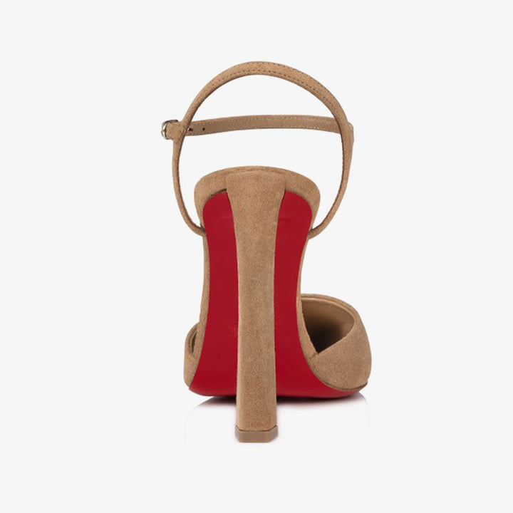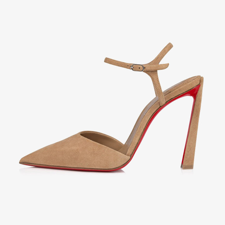 This pump features a pointed toe reminiscent of a bird’s beak, lending a bold touch to its sophisticated silhouette. Crafted in rich brown velvet, it showcases a daring low-cut vamp that reveals the foot with elegance. A slender ankle strap adds a delicate finish, while the 100 mm slanted heel completes the design with a graceful lift.