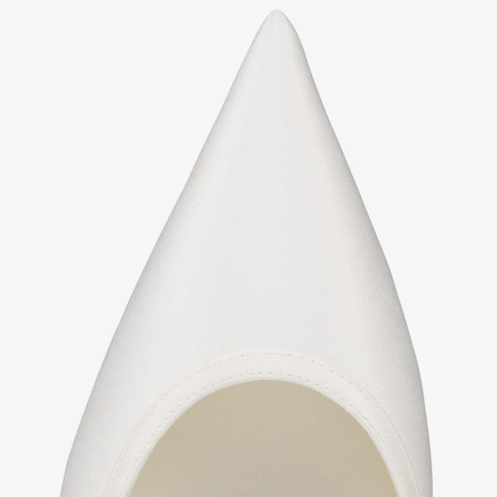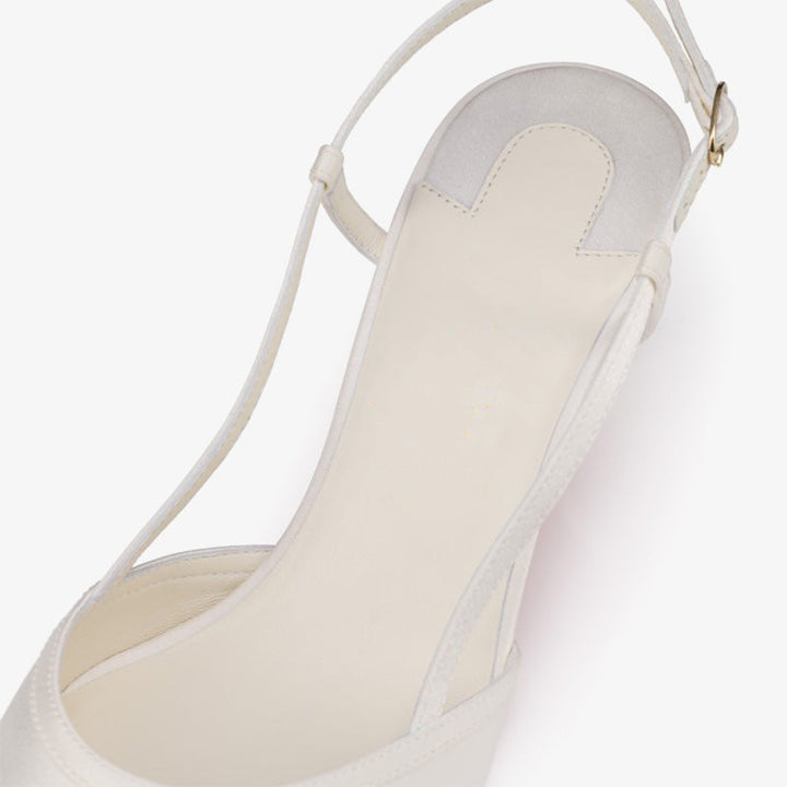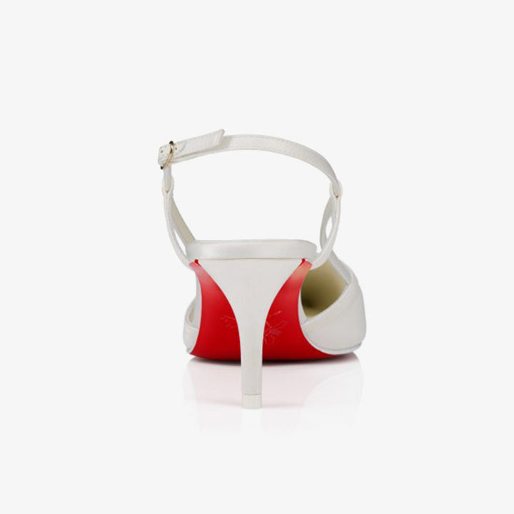 This is a modern slingback pump featuring a slightly elongated pointed toe and a slender strap. Its cleverly designed 60 mm heel is shaped to create the illusion of extra height, revealing the signature red sole from every angle. Crafted in all-over Ivory crepe satin with a tonal Snow white lining, this elegant silhouette exudes timeless sophistication. The design is finished with the innovative ‘Everlasting Red’ sole, developed using a special coating technique to ensure enhanced resistance and lasting vibrancy.