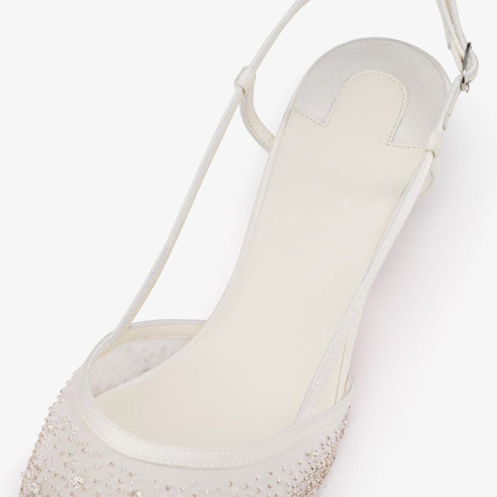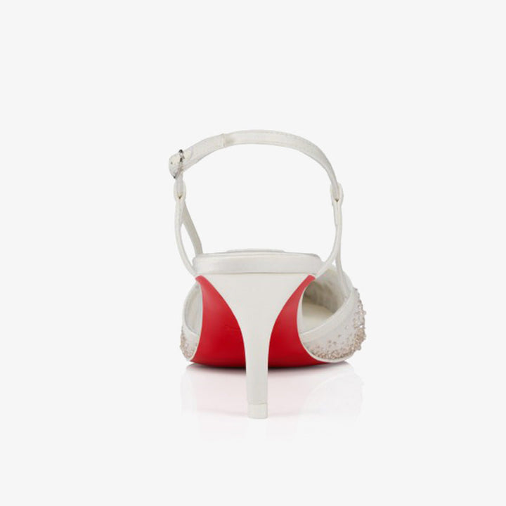 The Sling is a modern slingback pump featuring a slightly elongated pointed toe and a slender top strap. Its cleverly designed 60 mm heel creates the illusion of added height while elegantly revealing the iconic red sole from every angle. Crafted from delicate white fishnet and organza, this open-toe style showcases refined craftsmanship. It also features the innovative ‘Everlasting Red’ sole, developed with a special coating technique for enhanced resistance and lasting vibrancy.