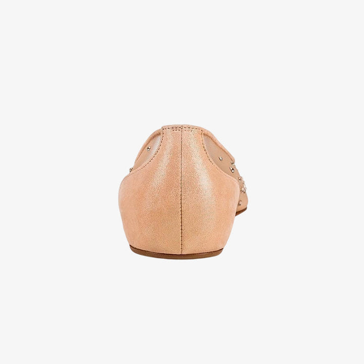 A true glass slipper, these pointed ballerina flats feature a slightly raised heel and sheer mesh vamp covered in hand-placed shimmering rhinestones. Finished with a soft calf suede heel counter in a neutral beige for an elegant, transparent look.