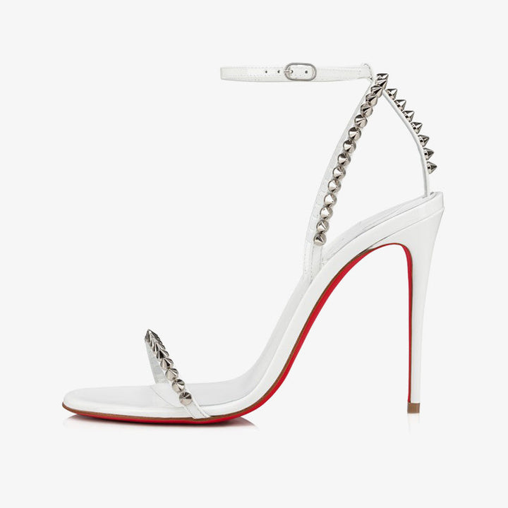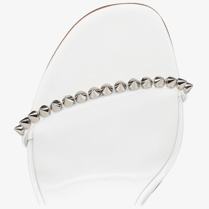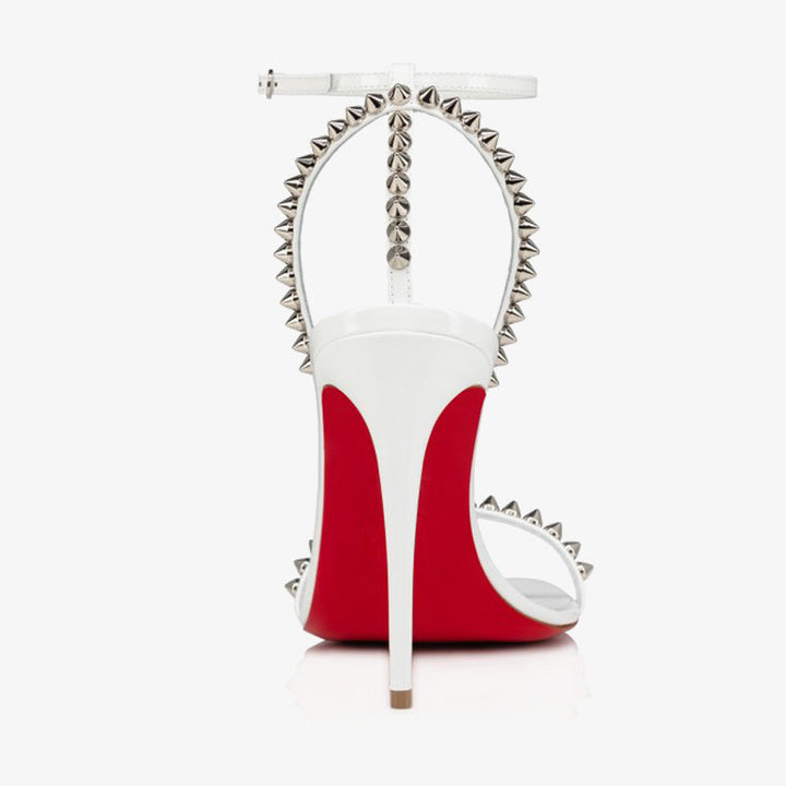 The stiletto is a powerful sandal that commands attention with its bold design. Crafted in glossy white patent calf leather, it features signature tonal spikes on both the toe and heel straps, an elegant pronounced arch, and a delicate yet daring 100 mm heel. The tonal lining and sleek finish create a captivating all-white silhouette—ideal for turning heads at any upscale event or evening occasion.