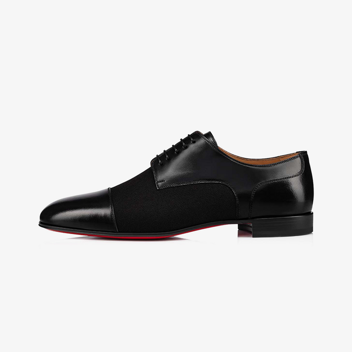 The perfect city shoe for rainy days, this classic derby features a wider fit with a flexible sole for comfort and durability, all while maintaining the iconic red sole. Crafted from black calfskin leather and canvas, it offers a timeless yet modern appeal.