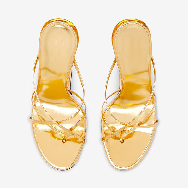 Radiant and sculptural, these gold sandals feature a mirrored block heel and layered flip-flop straps. A smooth leather footbed and rounded toe complete the sleek, modern silhouette.Upper: 100% calf leather