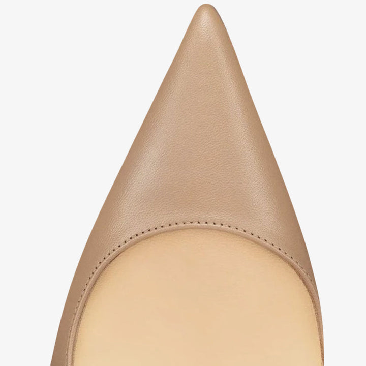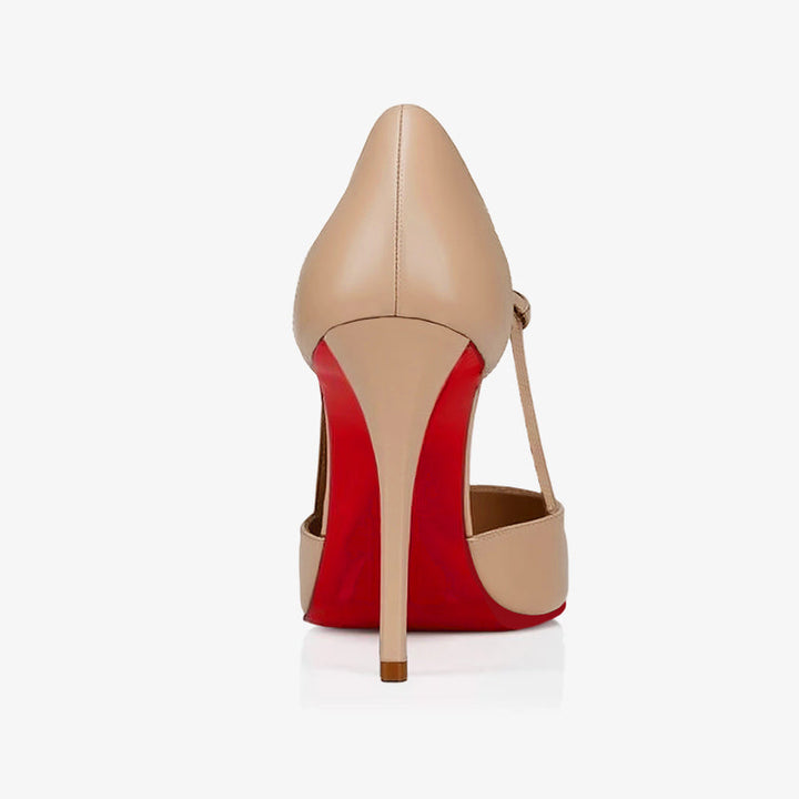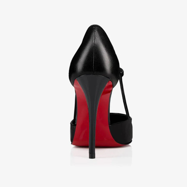 The sleek silhouette of this pump exudes sophistication. Set on a 100 mm stiletto heel, it reveals the iconic red sole and includes a padded insole for added comfort. Crafted in glossy black patent, the design features an open toe and a delicate strap. Thanks to an innovative coating technique, the signature red sole offers exceptional resistance and lasting vibrancy.