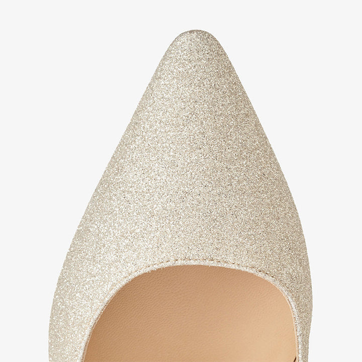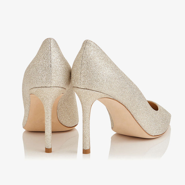 Dazzle with every step in these platinum glitter heels, designed to make an impact. Featuring a sleek pointed toe and a refined silhouette, this pair exudes effortless glamour. Leather lining and a smooth sole ensure comfort, making them the perfect choice for any special occasion.The heel height of this pair is 80mm.
