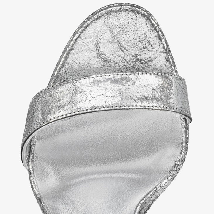 This sophisticated sandal showcases impeccable craftsmanship and modern flair. Crafted from silver laminated calf leather, the delicate straps gracefully frame the foot, while a slender ankle strap with a sleek clasp highlights elegance in every detail. The radiant silver tone adds a luminous touch to any outfit, and the bold 140 mm heel brings a daring, architectural lift—perfect for high-profile evenings or striking red carpet entrances.