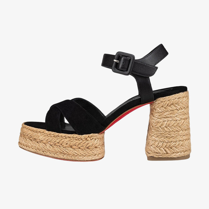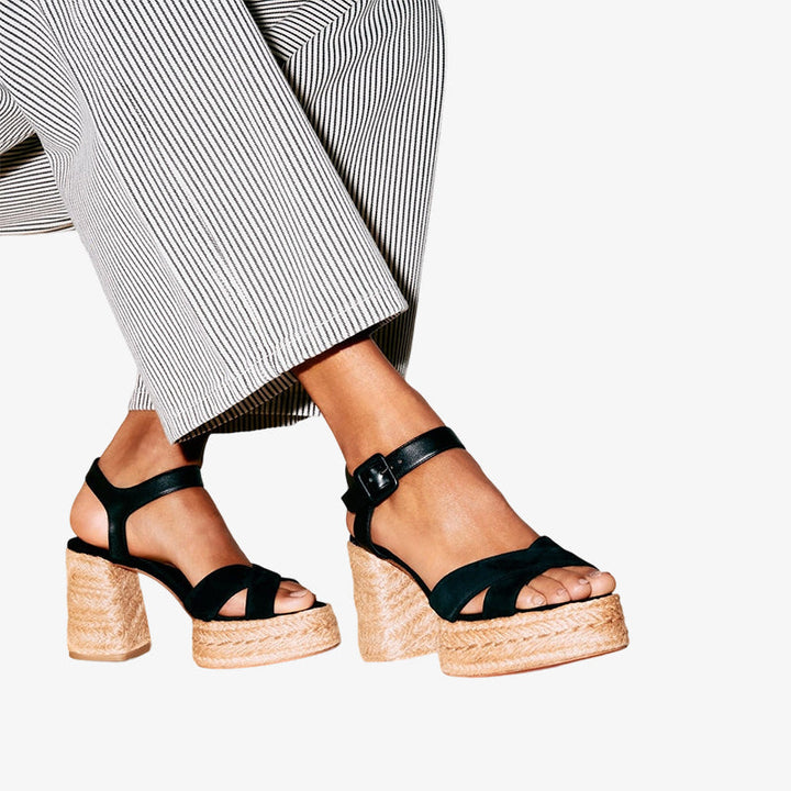 A modern take on the classic sandal, these sandals feature black suede crisscross straps and a braided sole. They feature a sleek leather ankle strap and metal buckle for a creative, architectural look.