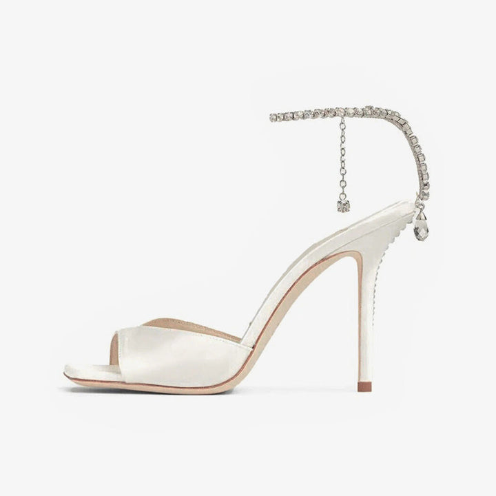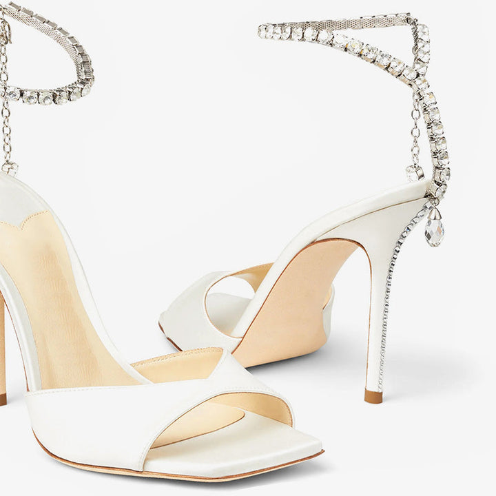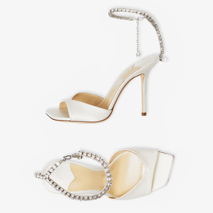 These elegant white satin sandals feature a slim 100mm heel and a pointed toe, adorned with a delicate crystal chain that drapes around the ankle and cascades along the heel. Crafted from a blend of certified viscose and organic silk, they blur the line between footwear and jewelry for a refined statement look.