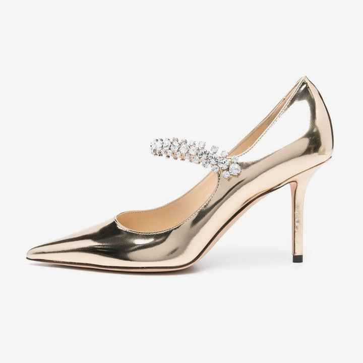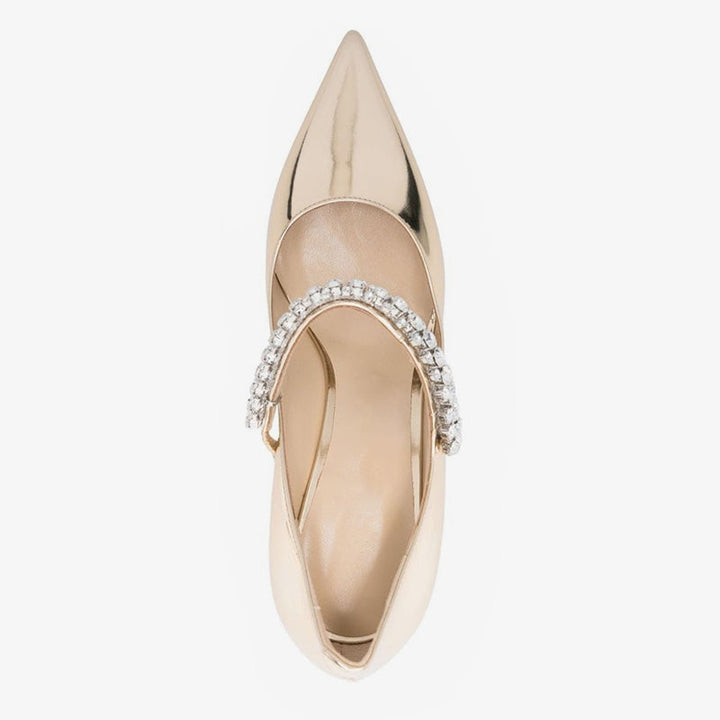 These leather pumps feature a crystal-embellished strap and a sleek 85mm heel, combining elegance with a touch of sparkle for a bold statement.