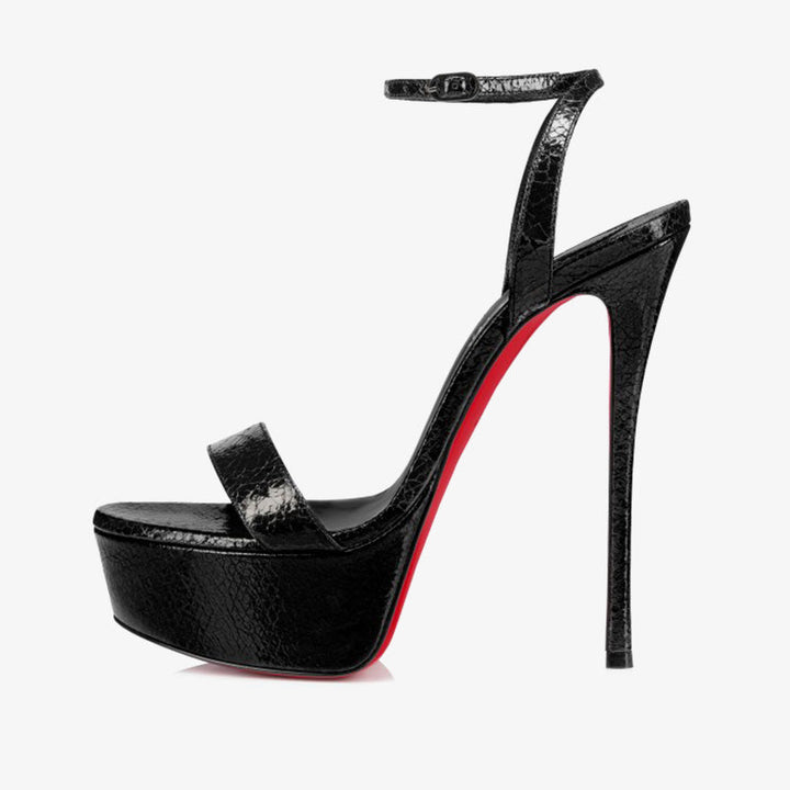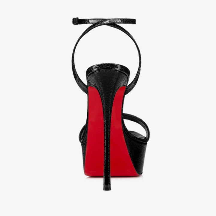 This sophisticated sandal reflects refined craftsmanship with a modern twist. Crafted in black Star textured laminated calf leather, the delicate straps elegantly frame the foot, while a slim ankle strap with a sleek clasp completes the silhouette. The bold black color adds an edge of mystery and glamour, and the striking 140 mm heel creates an architectural statement—perfect for evening wear or upscale events.