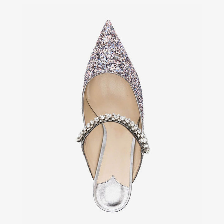 Radiating glamour in every step, these multicolor silver glitter mules are adorned with a crystal-embellished strap for a dazzling finish. The pointed toe and sleek open-back silhouette are elevated by a slender 65mm stiletto heel, while the leather lining and sole ensure a luxurious feel. A statement slip-on design made to shine.