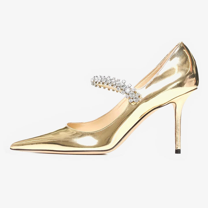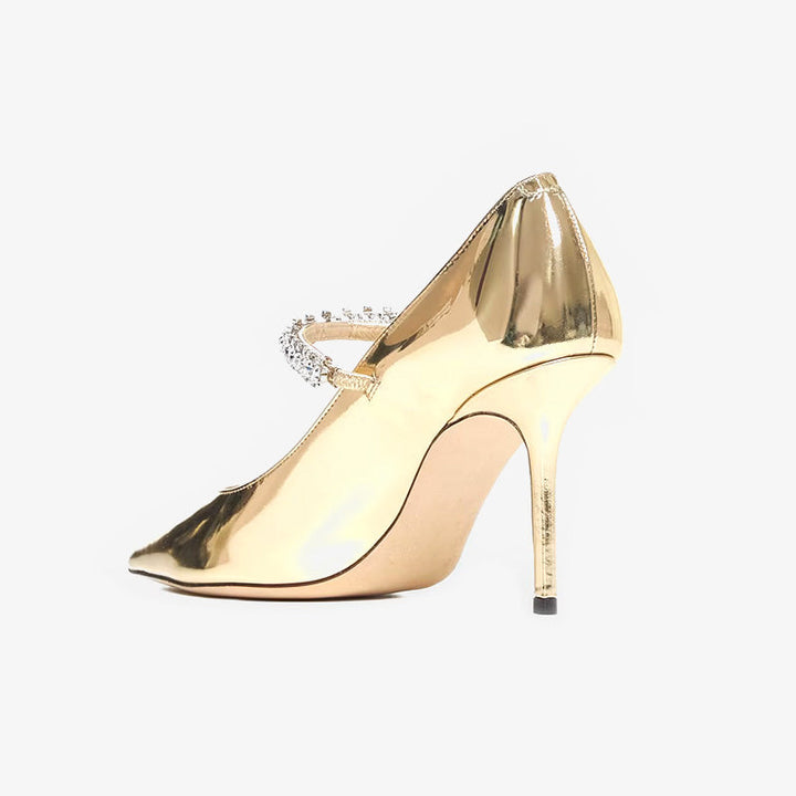 These women’s heels feature a glossy yellow patent finish, a pointed toe, and a crystal-embellished strap for added glamour. A striking blend of bold color and refined detail, perfect for standout occasions.