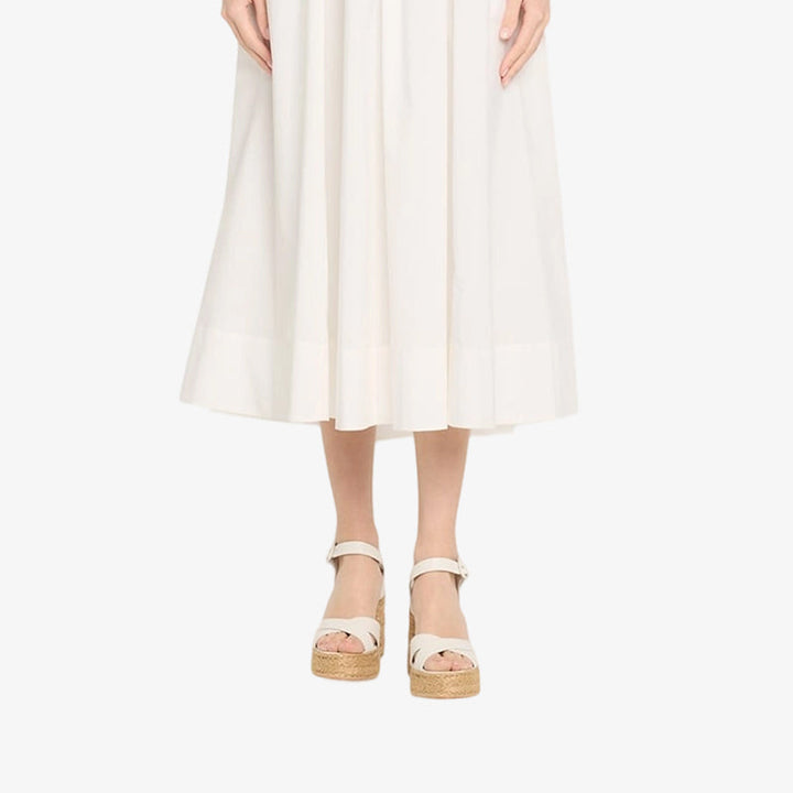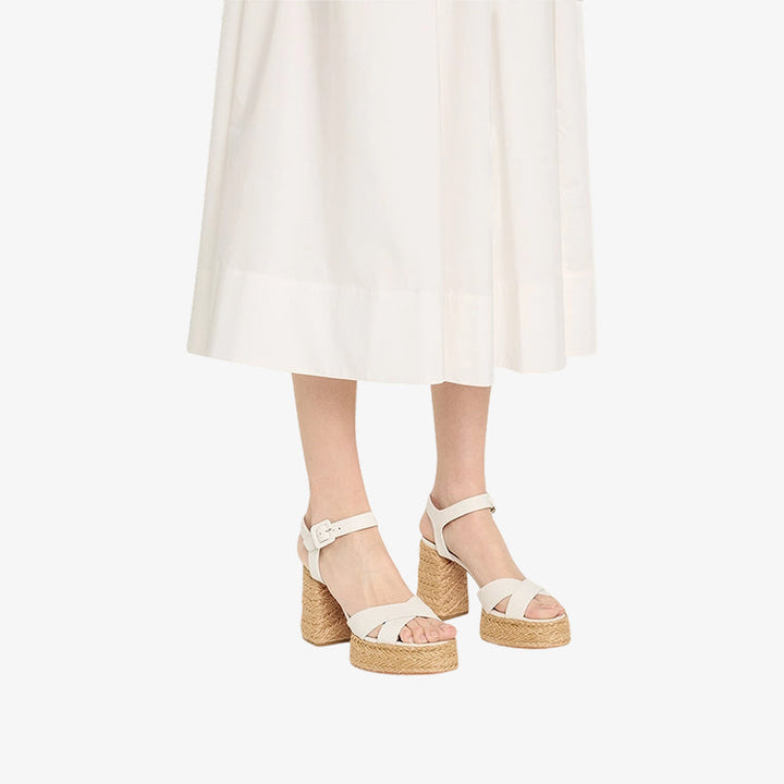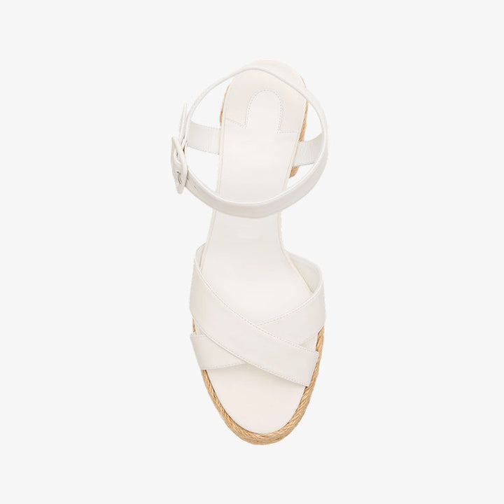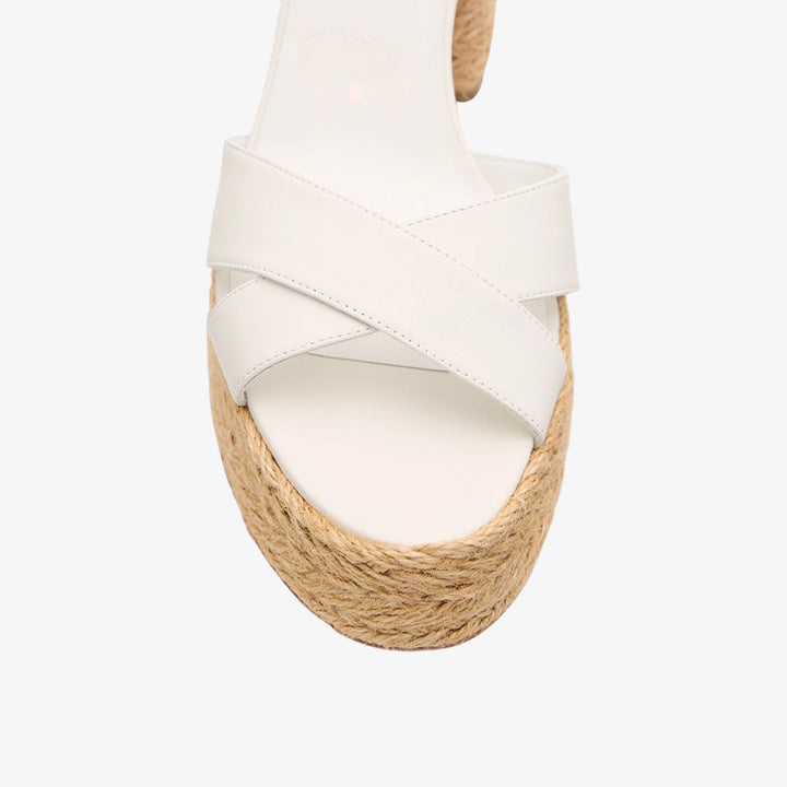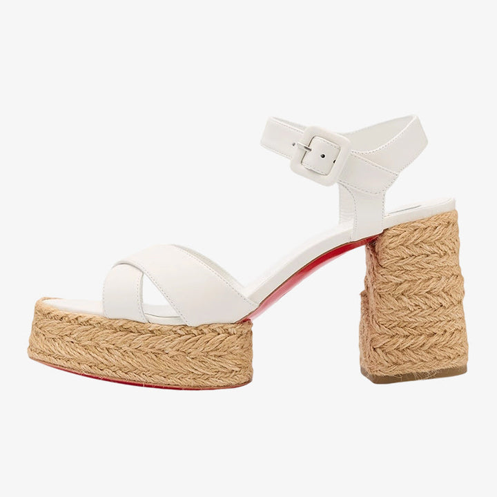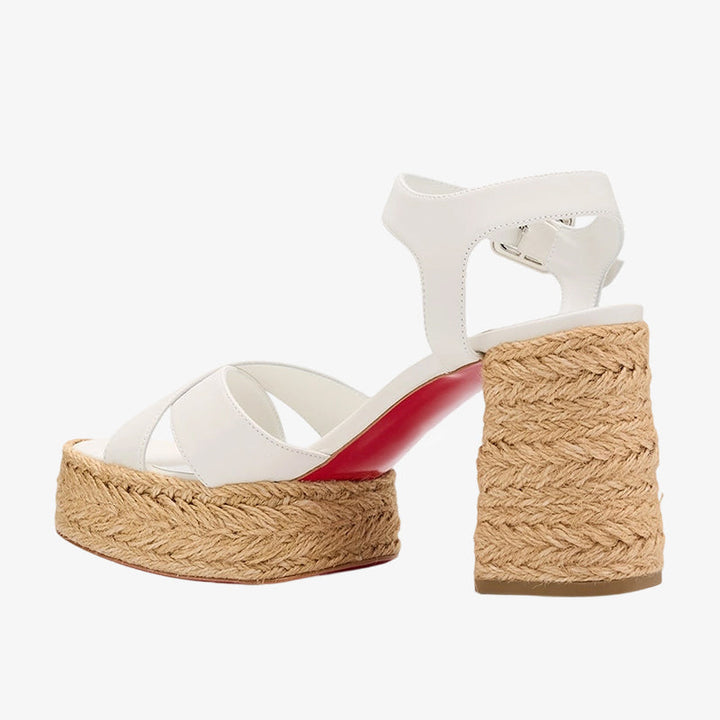 These white leather espadrille sandals feature a braided jute block heel, open toe, crisscross vamp, and an adjustable ankle strap. Finished with a red leather outsole, they blend casual charm with modern elegance.