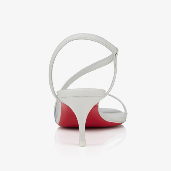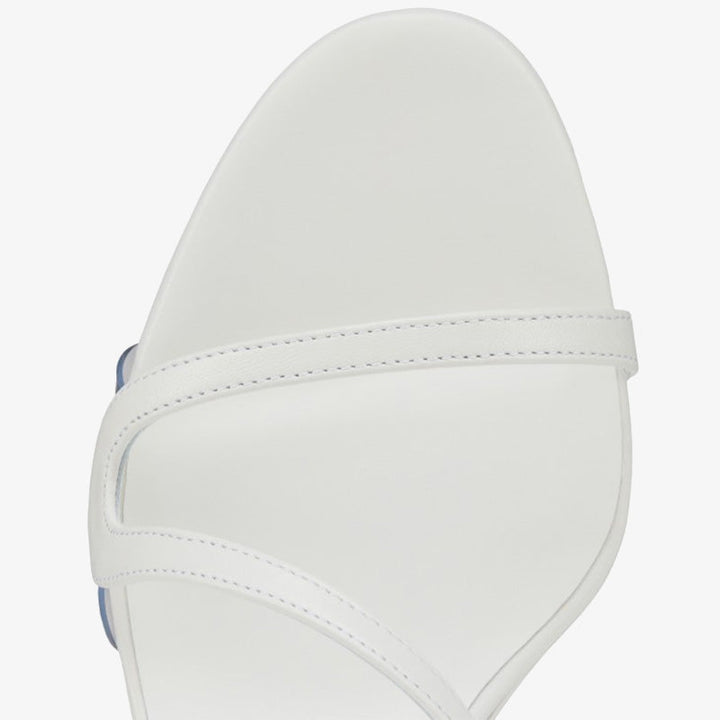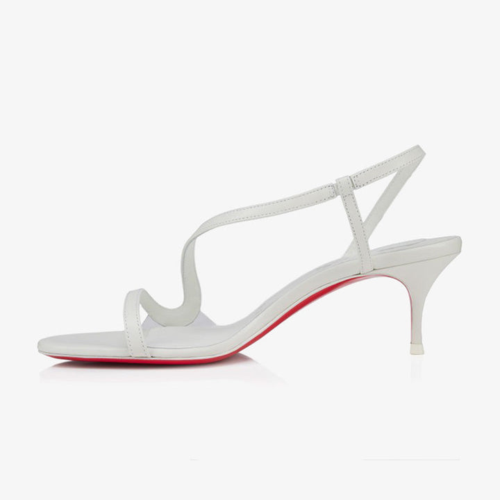 This striking sandal features a sculptural 60 mm kitten heel and an audacious slender strap that curves in a wave across the foot, elegantly elongating the leg. Crafted in white leather with PVC accents and finished with tonal lining, it brings a fresh, summery appeal to any outfit. The white color adds purity and lightness, while the modest heel offers graceful elevation.